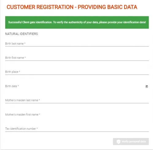 2. Entering personal data. All personal data must be entered in exactly the same manner as they are shown on the given person’s personal documents! For example, if the place of birth is Budapest, you will also have to enter the number of the district: Budapest 06. After entering the correct data, you have to choose to check of personal data for identification. If anything is misspelt when entering the key personal identification data of the registering natural person, an error message appears saying that identification based on the entered data failed and the process can only be continued after correcting the error.